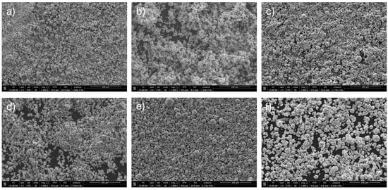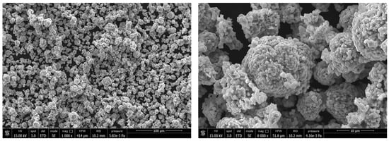 The morphology of the recovered powders for each pretreatment was analyzed using SEM, and the obtained images are shown in Figure 6. The mean particle area and diameter were also estimated, and the results are reported in Table 8. The particle size distributions of the recovered powder for the various pretreatments obtained from the image analysis of SEM results, used for the determination of the mean diameter, are displayed in Figure S10 of the Supplementary Materials.