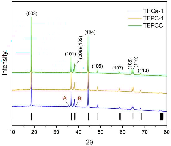 The material recovered using TEP in both cases exhibits peaks comparable to those of NMC532 (ICDD card number 01-086-2964). In the case of thermal pretreatment, however, two additional non-characteristic peaks, labeled A and B, are clearly visible. Lastly, the intensity of the peaks (003) and (101) is compared to each other. This parameter is crucial for assessing cationic mixing, which impacts the electrochemical properties of the material. When this ratio exceeds 1.2, the powder demonstrates favorable properties due to a low degree of cation mixing [37,38]. For THCa-1, the ratio between peaks 003 and 101 is 1.55, while, for TEPC-1, it is 1.49, and, for TEPCC, it is 1.45, confirming the efficacy of the pretreatment procedures. For the cycled battery, this ratio has a lower value, possibly due to the degradation that takes place during cycling.