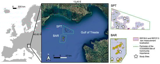 The study area is located in the Gulf of Trieste, northern Adriatic Sea (NE Italy, 45°42′05.4″ N, 13°42′50.4″ E; Figure 1). The gulf is a shallow semi-enclosed basin, with an average depth of about 16 m and not exceeding 40 m [43]. This region is characterized by strong river inflows, significant temperature and salinity seasonal variations, and high anthropic activity, including maritime transport, coastal industries, fishing, and tourism [30]. The investigated biogenic reefs were protected with the establishment in 2014 of the “Trezze San Pietro e Bardelli” Site of Community Importance (SCI; IT3330009). Fishing activities are prohibited in the two SCIs (ban measurement localization REF26.0 “Ban on professional fishing with trawl nets” and REF27.0 “Ban on professional fishing for mollusks” [44]). Sessile macrobenthic assemblages were studied in two areas within the SCI (Figure 1), referred to as SPT and BAR, over 4 years. SPT is located 9 km from the coast, at an average depth of 15 m, with an area of 24,000 m2, whereas BAR is located 19 km from the coast, at an average depth of 20 m, with an area of 12,000 m2 [45]. The outcrops in both areas belong to the “Tabular” type, consisting of biogenic reefs of the same kind (1–2 m in height), with some main outcrops of larger size (up to 4 m in height).