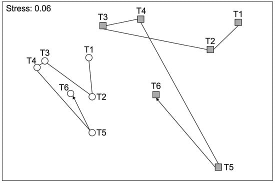 nMDS (non-metric multidimensional scaling) of Ti × Ar centroids based on Bray–Curtis similarity. The six sampling times are indicated as T1–T6. T1 (April 2021), T2 (August 2023), T3 (December 2023), T4 (February 2024), T5 (August 2024), and T6 (December 2024). BAR = white circles, SPT = dark grey squares.