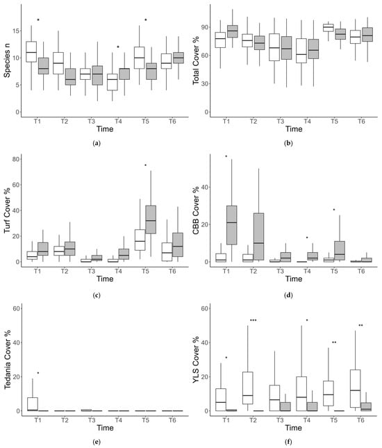 Boxplot for the total number of taxa (a), total percentage cover (b), and the cover for each of the four taxa mostly contributing to temporal variations in multivariate assemblage structure at the two study areas across the six sampling times (T1–T6). Turf (c), CBB (d), Tedania spp. (e), YLS (f). BAR (white bars) and SPT (dark gray bars). Asterisks indicate significant differences between the two areas at that specific sampling time. * = p < 0.05; ** = p < 0.01; *** = p < 0.001.