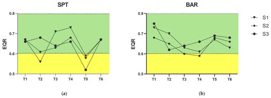 Values of NAMBER index for all sites (S1, S2, S3) in the two study areas (a) SPT and (b) BAR, across the six sampling times (T1–T6). A trend line for each site is reported. Green and yellow backgrounds show “Good” and “Moderate” ranges, respectively.