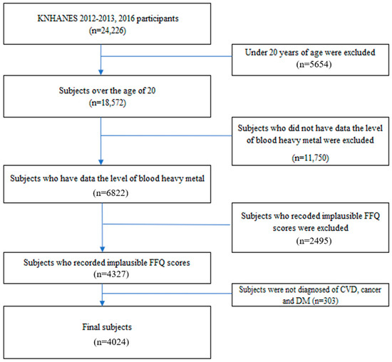 Among the 24,226 subjects who participated in the 2012, 2013, and 2016 KNHANES, we excluded subjects aged <20 years because dietary survey data were unavailable. We also excluded participants who did not have blood heavy metal levels (n = 11,750) or semi-quantitative food frequency questionnaire (SQ-FFQ) data (n = 2495). After excluding subjects who were pregnant or diagnosed with cerebrovascular disease, cancer, or diabetes mellitus, we finally included 4024 subjects in the analysis (Figure 1).