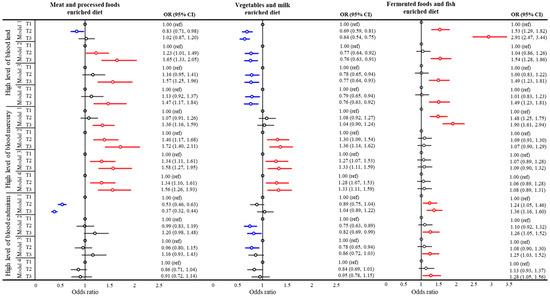 Forest plot of association between blood heavy metal levels and dietary pattern. Statistical significance is presented in red (p < 0.05). High heavy metal level was defined as the upper tertile group. Model 1: crude; model 2: adjusted for age, sex, and body mass index; model 3: same adjustments as model 2 plus region and occupation; model 4: same adjustments as model 3 plus smoking status and physical activity.