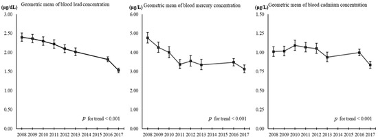 This study used data from the KNHANES, conducted from 2012 to 2016 (2014–2015 data were excluded because heavy metals were not measured). The KNHANES is a cross-sectional, population-based national survey conducted by the Korea Disease Control and Prevention Agency that aims to assess the health and nutritional status of the Korean population. The KNHANES started in 1998 and is conducted annually. The key contents of this survey are as follows: a health status assessment, a nutritional status assessment, health behaviors, healthcare utilization, and an accessibility assessment. To ensure representativeness, a stratified multistage probability sampling method was adopted. A total of 16,712 adults with measured blood heavy metal levels were included in the trend analysis.