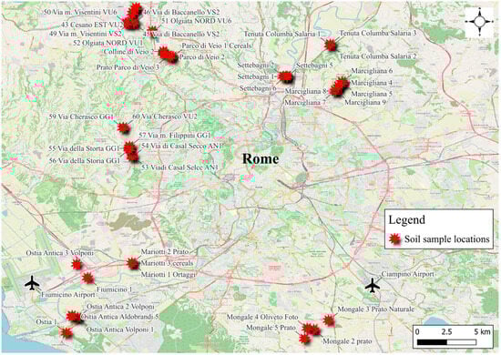 In the present study, the 59 study locations for soil sampling in Italy included Ostia Antica 2 Volponi AC2 (OA2V.AC2), Mariotti 3 Cereals AC2 (M3C.AC2), Mongale 1 Cereals VS3 (M1C.VS3), Mongale 2 Prato VS3 (M2P.VS3), Ostia Antica Volponi 1 AC2 (OAV1.AC2), Colline di Veio 2 SR1 (CdV2.SR1), Fiumicino 1 (F1), Mongale 5 Prato VS3 (M5P.VS3), Mariotti 1 Ortaggi AC2 (M1O.AC2), Mongale 3 Prato Naturale IN (M3PN.IN), Ostia Antica 4 AC2 (OA4.AC2), Ostia 1 DU1 (O1.DU1), Colline di Veio 1 SR1(CdV1.SR1), Parco di Veio 1 Cereals VU4 (PdV1C.VU4), Mongale 4 Oliveto Foto SR1 (M4OF.SR1), Ostia Antica 3 Volponi (OA3V), Ostia Antica Aldobrandi 5 AC2 (OAA5.AC2), Colline di Veio 3 Soil Sottile SR1 (CdV3SS.SR1), Prato Parco di Veio 3 VU4 (PPdV3.VU4), Parco di Veio 2 VU4 (PdV2.VU4), Mariotti 2 Prato AC2 (M2P.AC2), Marcigliana 5 VU3 (M5.VU3), Tenuta Columba Salaria 2 AC3 (TCS2.AC3), Settebagni 4 AC2 (S4.AC2), Tenuta Columba Salaria 1 AC3 (TCS1.AC3), Marcigliana 8 AN2 (M8.AN2), Marcigliana 3 VU3 (M3.VU3), Settebagni 6 AC1 (S6.AC1), Marcigliana 6 VU3 (M6.VU3), Marcigliana 7 AN2 (M7.AN2), Marcigliana 9 AN2 (M9.AN2), Marcigliana 1 VU3 (M1.VU3), Marcigliana 2 VU3 (M2.VU3), Marcigliana 4 VU3 (M4.VU3), Settebagni 2 AC1 (S2.AC1), Settebagni 1 AC1 (S1.AC1), Settebagni 5 AC2 (S5.AC2), Settebagni 3 AC2 (S3.AC2), Tenuta Columba Salaria 3 AC3 (TCS3.AC3), 60 Via Cherasco VU2 (60VC.VU2), 49 Via m. Visentini VS2 (49VmV.VS2), 41 Cesano EST VU2 (41CE.VU2), 46 Via di Baccanello VS2 (46VdB.VS2), 58 Via m. Filippini GG1 (58VmF.GG1), 55 Via della Storta GG1 (55VdS.GG1), 42 Cesano EST VU2 (42CE.VU2), 54 Via di Casal Secco AN1 (54VdCS.AN1), 59 Via Cherasco GG1 (59VC.GG1), 52 Olgiata NORD VU1 (52ON.VU1), 53 Viadi Casal Selce AN1 (53VCS.AN1), 44 Cesano EST VU2 (44CE.VU2), 57 Via m. Filippini GG1 (57VmF.GG1), 47 Via di Baccanello VS2 (47VdB.VS2), 48 Via di Baccanello VS2 (48VdB.VS2), 45 Via di Baccanello VS2 (45VdB.VS2), 50 Via m. Visentini VU6 (50VmV.VU6), 51 Olgiata NORD VU6 (51ON.VU6), 43 Cesano EST VU2 (43CE.VU2), and 56 Via della Storia GG1 (56VdS.GG1). The characteristics of the 59 sampling locations are described in Table S1.