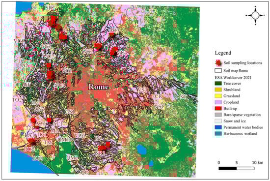 In 2023, a total of 59 agricultural soil samples were collected from the upper 30 cm surface layer using a drill in three separate batches (April, May, and July) from Rome, Italy, encompassing various land uses, such as tree cover, shrubland, grassland, cropland, and built-up areas. Figure 1 illustrates the study area for these soils. A composite sample (1 kg of soil) was taken at each site, comprising 15–20 subsamples. These samples were placed in airtight polyethylene bags, labeled with coordinates, location names, and cultivation types, and transported to the laboratory for analysis []. Primary geographic data were obtained from Google Earth and QGIS 3.34 []. The first and second batch soils were dried at room temperature for 1–2 weeks, while the third batch soils were dried in a hot air oven at 60 °C for two days. After drying, all soils were passed through a 2 mm stainless steel sieve to remove debris and stone fragments. The weights of the fine earth and stone fragments were measured and recorded. The fine earth was then split into two halves and stored in Ziploc bags, with one half designated for immediate laboratory experiments and the other for future use.