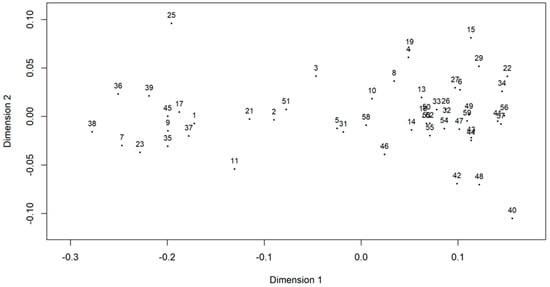 On the right side of the multidimensional scaling plot, a subgroup of samples, including labels 13, 14, 55, 50, 52, 18, 32, 33, 26, 54, 47, 59, 49, 44, 43, 6, and 27, is tightly clustered, indicating significant similarity among these samples. This subgroup is positioned within a larger, more diffuse group composed of samples 42, 48, 57, 41, 56, 34, 22, 29, 15, 19, 4, 8, 10, 58, and 46. The presence of this subgroup within the broader cluster suggests that, while the samples share some common characteristics, the subgroup exhibits a higher degree of internal homogeneity. This pattern may reflect a hierarchical structure in the data, where the subset represents a more specific condition or feature set within the broader context of the larger group’s shared characteristics. Further analysis is needed to understand the factors driving this internal structure and the relationship between the subgroup and the larger group.