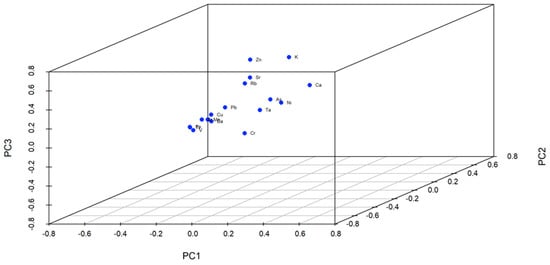The 3D loadings plot reveals a distinct clustering of elements based on their contributions to the three principal components. Elements such as Fe, Ti, and V are tightly clustered near the origin, suggesting similar loading patterns and contributions to the variance captured by the components. In contrast, elements like K and Ca are more distantly positioned, indicating unique contributions, with K primarily associated with PC2 and PC3 and Ca with PC1. A moderate cluster involving Pb, Cu, Ba, Rb, and Sr suggests shared variance contributions among these elements, alongside PC1 and PC2. Zn and K are positioned relatively far from the central cluster, indicating they have unique loading patterns, particularly along PC3 for Zn and PC2 for K, suggesting that these elements have distinct influences on the variance along these components compared to other elements.