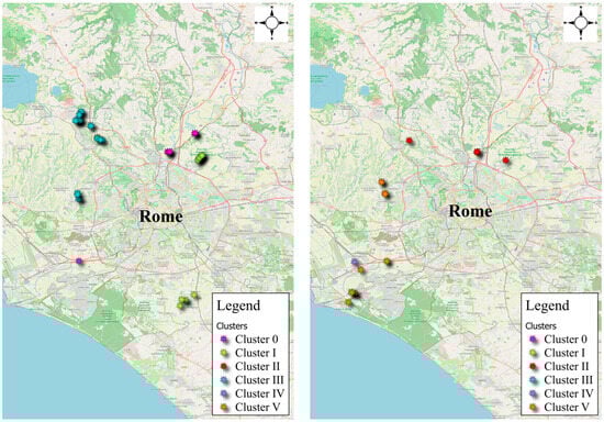 For the spatial clustering analysis of soil heavy metals, the study area encompassed Rome’s urban and peri-urban regions. Soil samples from 59 locations across Rome were collected and analyzed using k-means clustering with six clusters. This number of six clusters resulted from the previous PCA and HCA analysis of the full data set and from a final optimization resulting from a trial and error approach until coherent spatial results were obtained. This method accounted for the exact geographic coordinates of each sample collection point, providing a comprehensive analysis of the spatial distribution of the soil samples. The clustering results were then analyzed to assess the spatial distribution patterns of soil heavy metals across Rome, offering valuable insights into potential sources and spatial variability.