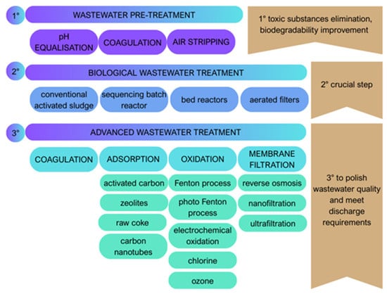 Wastewaters containing phenols, cyanides, and thiocyanates are regarded as one of the most difficult industrial effluents to treat due to their complex composition. Consequently, modern treatment strategies usually demand a combination of physical, chemical, and biological processes to meet increasingly stringent environmental regulations []. Figure 1 provides an overview of the treatment methods for wastewater containing phenols, cyanides, and thiocyanates. According to the EU Industrial Emissions Directive and the corresponding Best Available Technique (BAT) Reference Document for Common Waste Water and Waste Gas Treatment/Management Systems in the Chemical Sector, the maximum allowable concentrations for phenol, free cyanide, and thiocyanate in treated industrial effluents discharged into natural water bodies are typically set at 0.1 mg/L for each compound []. While treatment technologies are well established, the design capacity of industrial wastewater treatment plants varies significantly depending on the specific production scale and local regulations. For example, Bargiel et al. [] report a treatment plant capacity of 600 m3/day for coking industry wastewater, while the authors are familiar with two facilities in the region with capacities of approximately 1200 m3/day and 700 m3/day, respectively. This is not surprising given that such industries typically generate enormous volumes of highly polluted effluents that require complex and large-scale treatment systems [].