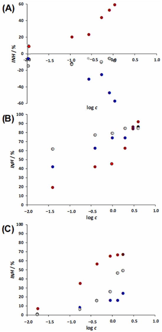 A comparison of the data on the inhibition (INH) of plant growth (blue circles), root growth (gray circles), and chlorophyll formation (red circles) for: (A) phenol, (B) cyanide, and (C) thiocyanate. The parameter log c stands for the logarithmic amounts of the molar concentrations expressed in mM.