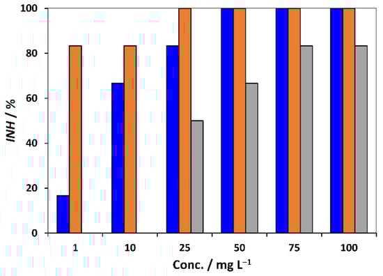 where γ is the logarithmic value of this parameter, INH is the percentage of inhibition achieved for each concentration tested, and 100 is 100%, which is the maximum inhibition value. This parameter is very suitable for a rapid assessment of toxicity, as its logarithmic value is zero when the concentration of the toxicant is equal to the EC50 value.