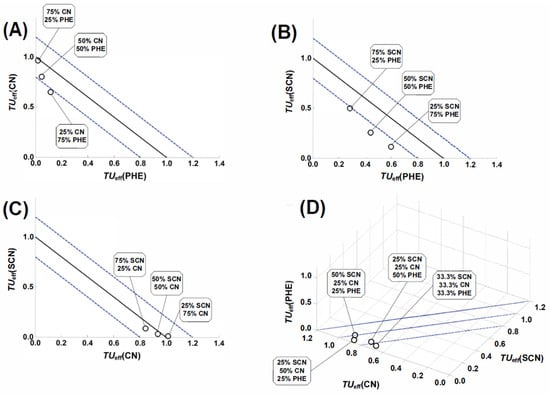 Isobolograms of mixtures of phenol (PHE), cyanide (CN), and thiocyanate (SCN). Cases (A–C) refer to binary mixtures, while case (D) refers to a ternary mixture. For each data point, the composition of the mixture is shown for ease of reference (as text within the octagon), with the values expressed as a percentage representing the proportion of each toxicant in the total concentration of 1.0000 mM (black lines-indicates additivity; blue lines synergy or antagonism).