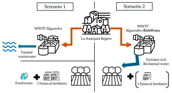 Scenario 1 considers using fresh local water for irrigation, combined with the application of 100% of chemical nutrients according to the fertilization plan provided by local farmers from La Axarquia. Scenario 2, by contrast, considers using RichWater RW, and the nutrient concentration is adjusted upstream by adding chemical fertilizer if needed. All the data correspond to a flow rate of 500 m3 day. of treated effluent. By comparing these two alternative scenarios, the added value generated by the project can be economically assessed, allowing for an evaluation of the costs and benefits attributable to the RichWater system [25].