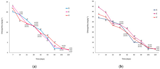 Chlorpyrifos soil concentrations in the 25 ppm (a) and 50 ppm (b) up to 120 days after spiking. Statistical analysis was performed for each contamination separately; different letters refer to significant differences in each treatment. The codes S, E, and V refer to Soil, Soil + Earthworms, and Soil + Vermicompost, respectively.