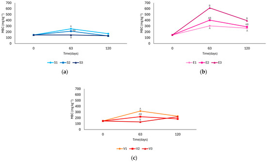 Figure 2a shows a dose-dependent trend with significant differences (A, AB, B), but only at half of the test. On day 120, MBC values returned to the initial values and did not show significant differences between the concentrations tested.