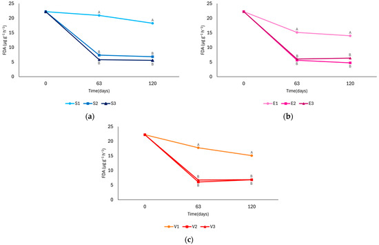 FDA hydrolysis trend measured for each treatment: S = Soil (a), E = Soil + Earthworms (b), and V = Soil + Vermicompost (c). Statistical analysis was performed for each time separately (0, 63, and 120 days); different letters refer to significant differences between each contamination (0 ppm code: 1, 25 ppm code: 2 and 50 ppm code: 3). In the sampling times where the letters are not present, no significant differences were found between the concentration tested.