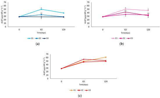 Alkaline phosphatase trend measured for each treatment: S = Soil (a), E = Soil + Earthworms (b), and V = Soil + Vermicompost (c). Statistical analysis was performed for each time separately (0, 63, and 120 days); different letters refer to significant differences between each contamination (0 ppm code: 1, 25 ppm code: 2 and 50 ppm code: 3). In the sampling times where the letters are not present, no significant differences were found between the concentration tested.