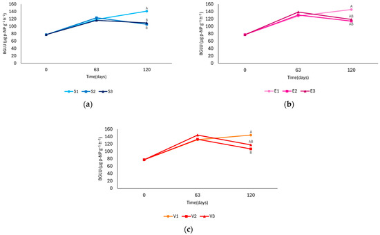 β-glucosidase trend measured for each treatment: S = Soil (a), E = Soil + Earthworms (b), and V = Soil + Vermicompost (c). Statistical analysis was performed for each time separately (0, 63, and 120 days); different letters refer to significant differences between each contamination (0 ppm code: 1, 25 ppm code: 2 and 50 ppm code: 3). In the sampling times where the letters are not present, no significant differences were found between the concentration tested.