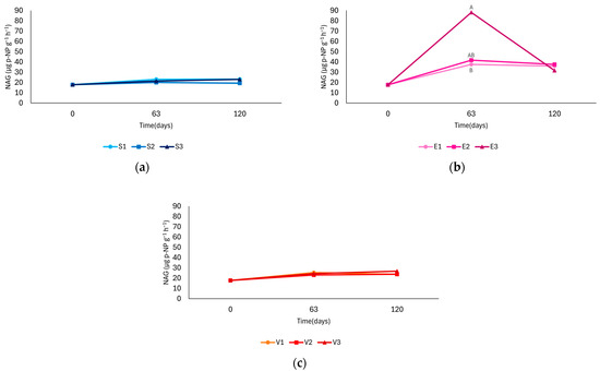 β-N-acetyl-glucosaminidase trend measured for each treatment: S = Soil (a), E = Soil + Earthworms (b), and V = Soil + Vermicompost (c). Statistical analysis was performed for each time separately (0, 63, and 120 days); different letters refer to significant differences between each contamination (0 ppm code: 1, 25 ppm code: 2 and 50 ppm code: 3). In the sampling times where the letters are not present, no significant differences were found between the concentration tested.
