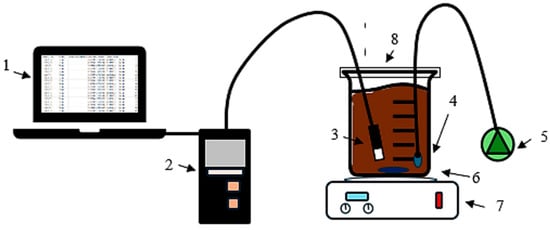 Schematic representation of the laboratory equipment for OUR respirometric tests. Legend: 1: Laptop: data transfer; 2: Oximeter; 3: DO probe; 4: Porous stone; 5: Air compressor; 6: Magnet; 7: Magnetic and thermostatic stirrer; 8: Parafilm.