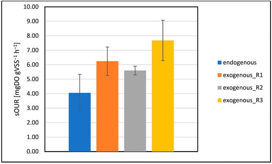 OUR tests performed on activated sludge biomass in the presence of different liquid wastes rich of PFAS (R1, R2, R3), reported in Figure 2, show that all exogenous single-OUR values are higher than the endogenous one. This indicates the absence of short-term acute toxicity effects, since the biomass continues to consume oxygen in the presence of the fed substrate.