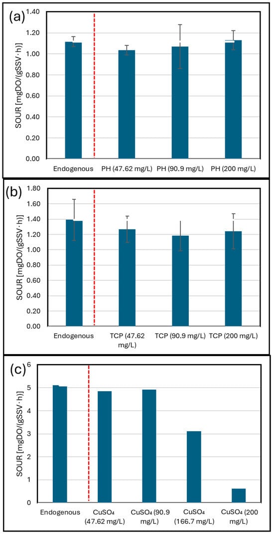 To evaluate a possible inhibitory effect due to the presence of waste containing PFAS, the respiration rates of the activated sludge biomass after exposure to “traditional” inhibitors were calculated. These inhibitors could be present in industrial wastewater treated by the platform that provided us with the PFAS-containing substrates. Phenol, trichlorophenol (TCP), and copper sulphate were tested, each at different concentrations as reported in Table 2. The results obtained are illustrated in Figure 3.