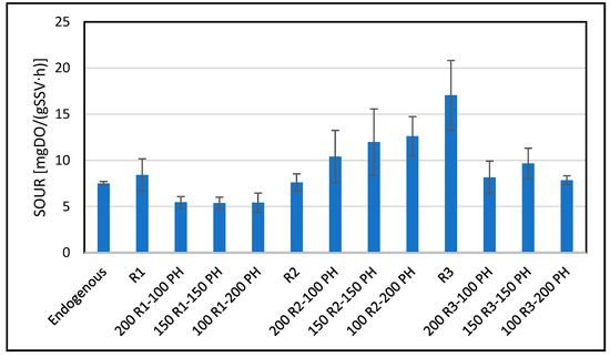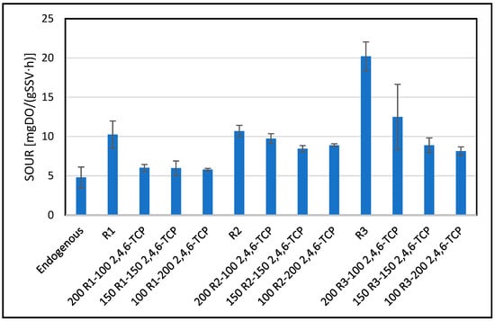In the second phase, batch and continuous OUR tests were used to assess the short- and long-term effects of high-concentration inhibitors (200 mg L−1) mixed with aqueous waste (R1, R2, R3) on biomass activity, providing insight into immediate toxicity and adaptation under complex contamination conditions [9].