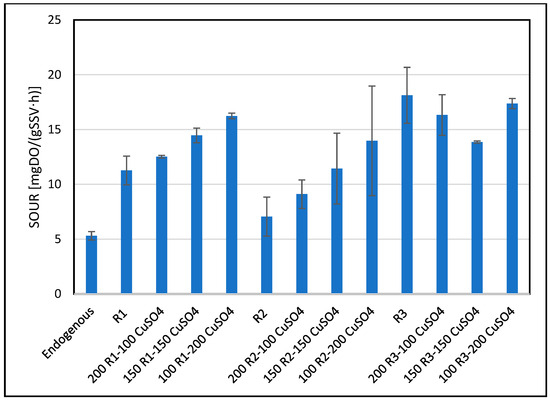 The results reported in Figure 6 illustrate the effect of PFAS substrates mixed with copper sulphate on biomass respiration. In this case, the behaviour observed is even more marked with respect to the presence of TCP. In fact, contrary to what one might expect, as the amount of CuSO4 dosed increases, an increase in biomass respiration values is recorded. This phenomenon could be attributed to a biomass lysis process [28]. As highlighted in the previous step, copper sulphate has an acute toxic effect on the biomass, which could lead to the destruction of some cells. This lysis process can release a significant amount of organic matter from the disintegrated cells into the mixture, making it available for metabolism by the surviving biomass. As a result, the uninhibited fraction of the biomass can utilize this secondary substrate, leading to an apparent increase in respiratory activity. However, in the case of R3, the addition of copper sulphate does not lead to an increase in oxygen uptake rate (OUR), unlike in R1 and R2. Another important observation is that, even in the presence of high concentrations of PFAS, respiration values never fall below the endogenous respiration level, regardless of the mixture composition. This finding confirms that waste containing PFAS, despite its high concentrations, does not exert a significant inhibitory effect on the biomass. Instead, it suggests a certain adaptive capacity of the microbial consortium under the tested experimental conditions.