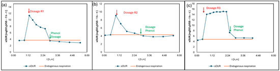 Results of continuous OUR tests analyzing the effect of waste containing PFAS ((a) R1, (b) R2, (c) R3) appropriately mixed with phenol in order to evaluate a comparison with a known inhibitor.