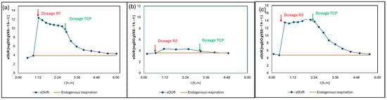 Results of continuous OUR tests analyzing the effect of waste containing PFAS ((a) R1, (b) R2, (c) R3) appropriately mixed with trichlorophenol in order to evaluate a comparison with a known inhibitor.