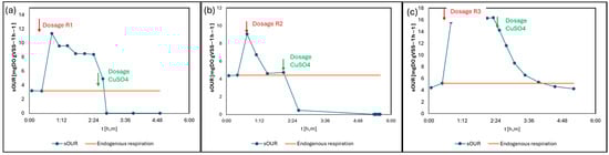 Results of continuous OUR tests analyzing the effect of waste containing PFAS ((a) R1, (b) R2, (c) R3) appropriately mixed with copper sulphate in order to evaluate a comparison with a known inhibitor.
