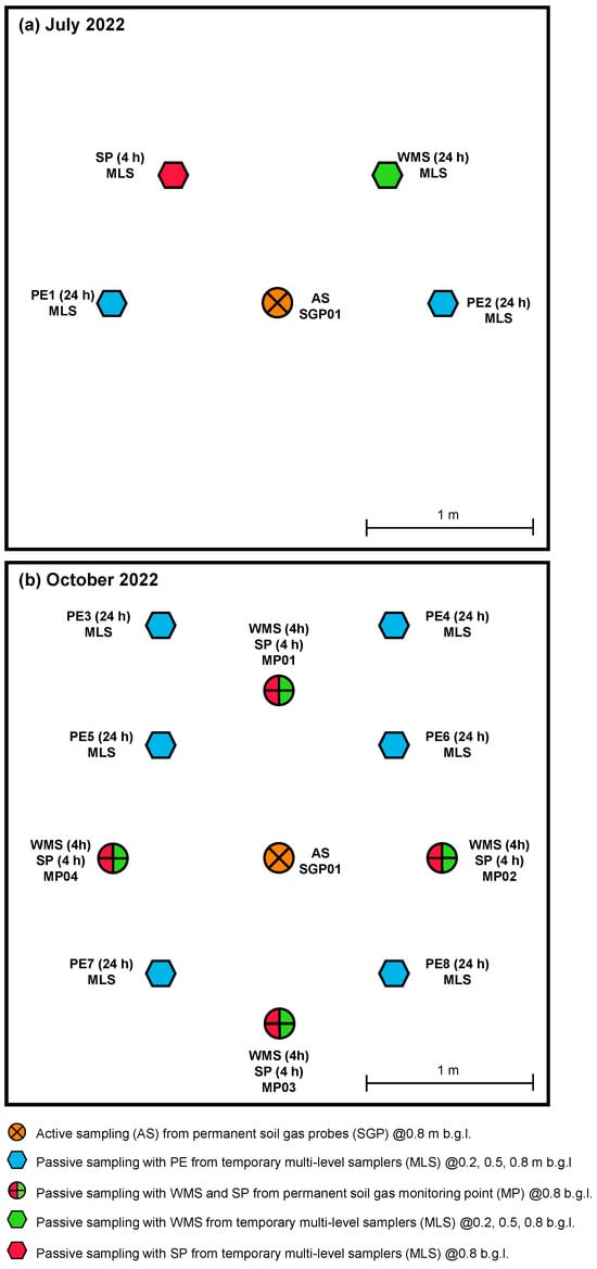 This study presented an experimental comparison of soil gas sampling methods through five field campaigns conducted at two Italian industrial sites characterized by the presence of BTEX and chlorinated solvents in the subsurface. By evaluating traditional active techniques, such as stainless-steel canisters, vacuum bottles, and sorbent tubes, alongside advanced passive approaches, such as low-density polyethylene membranes, sorbent pens, and Low Uptake Rate Waterloo Membrane Samplers™, the research highlights key strengths and limitations of each tested soil gas monitoring method. The results of the study provide valuable insights and recommendations for improving the detection and characterization of VOC contamination in the subsurface.