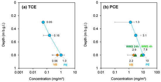 Average concentration values obtained for (a) trichloroethene (TCE) and (b) tetrachloroethene (PCE) with different active (vacuum bottles, VBs) and passive (Waterloo Membrane Samplers, WMS and polyethylene films, PE) soil gas sampling systems in the August 2020 test for the entire experimentation area at Porto Marghera.