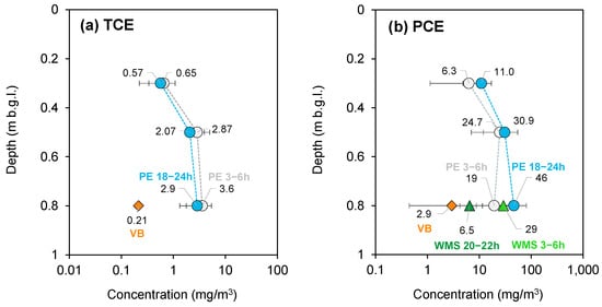 For this campaign, PE was the only system tested at different depths. Figure 3 shows that for both compounds, an increase in average concentration by approximately a factor of 10 can be observed with an increasing sampling depth. The concentrations of TCE obtained with the passive PE-based samplers were consistent with those measured with the active system (VB) at the same depth. For PCE (Figure 3b), the data obtained with PE showed slightly higher concentrations than those obtained with the active sampling system (VB). However, these concentrations were similar to those obtained with the passive WMS system exposed for 4 h. Additionally, the results obtained with the WMS exposed for 24 h were slightly higher than those obtained with the shorter exposure time (4 h). This could be due to a potential saturation effect of the samplers for longer exposure times, which could result in an underestimation of the actual concentrations detected []. Nevertheless, the three different tested systems appear to provide consistent information for the two compounds. When analyzing the results obtained using the different sampling systems, it should be noted that while the study area was relatively small, the systems were not deployed at exactly the same locations. As such, some discrepancies between the different sampling methods may also be partially attributed to spatial variability in contamination levels. In the specific case of Porto Marghera, however, an examination of the concentrations measured at individual sampling points (as reported in the SI) suggests that spatial variability was limited. Indeed, for each compound, concentrations recorded at the same depth were generally within the same order of magnitude.