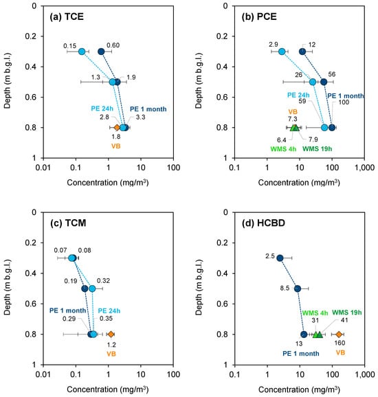 Average concentration values obtained for (a) trichloroethene (TCE), (b) tetrachloroethene (PCE), (c) trichloromethane (TCM), and (d) hexachlorobutadiene (HCBD) with different active (vacuum bottles, VBs) and passive (Waterloo Membrane Samplers, WMS and polyethylene films, PE) soil gas sampling systems in the September 2022 test for the entire experimentation area at Porto Marghera.