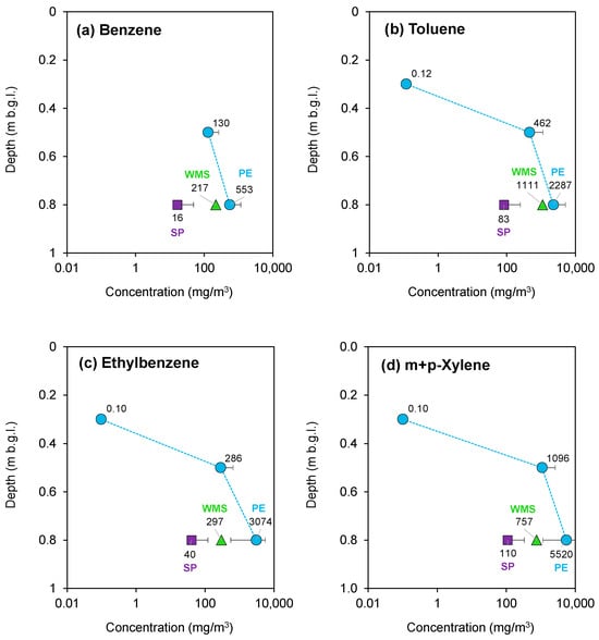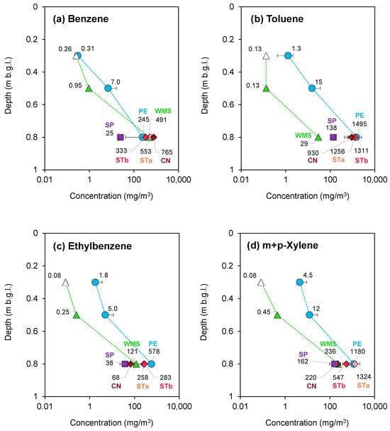 It can be observed that for BTEX (Figure 6), there is a strong increase in average concentrations (by a factor of approximately 100–1000) with increasing sampling depth. In Figure 6, the comparison of BTEX values obtained at a depth of 0.8 m b.g.l demonstrates a certain degree of variability in the results provided by active sampling systems, even when the same system is utilized (i.e., STa and STb). This variability is observed to be relatively minor for benzene and toluene, whereas it was more pronounced, by a factor of approximately 10, for ethylbenzene and m+p-xylene. It can be observed that the results provided by PE are consistent with those obtained through active sampling. Similarly, WMS yields results that align with those of active sampling and PE for benzene and ethylbenzene, while exhibiting lower values for toluene and, to a lesser extent, for m+p-xylene. SPs exhibited lower values than the other systems tested for most of the compounds. This can partly be attributed to improper fiber exposure (as the fiber was not fully retracted), which was caused by an unsuitable insertion system. As observed in the other case study, another factor to consider when interpreting the differences observed across the various sampling systems is the spatial variability of subsurface contamination. Although the concentrations measured using both PE and active systems at different sampling points were generally within the same order of magnitude (see Supplementary Information), the lower concentrations detected by the sorbent pens could also be partially attributed to lower local contamination at the specific monitoring point.