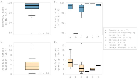 MP extraction rate (blue) and residual matter quantity (yellow) after full extraction process. This figure presents MP extraction rate (as a percentage of the number of spiked microplastics) after full treatment, with all samples combined (A) and depending on the sample’s matrix categories (B), as well as the average of the mass of residual materials (microplastics present before spiking in the matrix and organic residues) expressed as a percentage of the initial mass; all samples taken together (C) and as a function of the nature of the organic waste product (D).