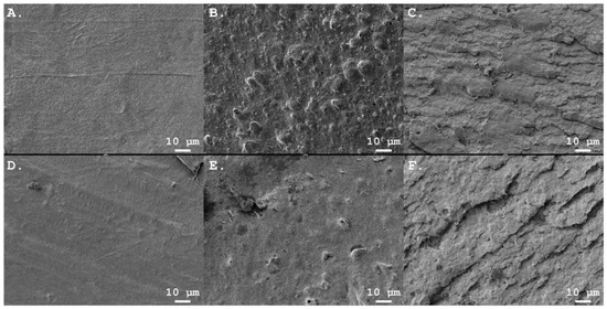 Scanning electron microscopy (SEM) photos (1000×) for PE (A,D), PLA-PBAT (B,E) and PVC (C,F) microplastics before (A–C) and after treatment (D–F).