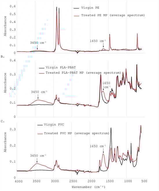 Comparison of virgin MP spectrum (before treatment, black) and average (n = 3) MP spectrum (after treatment, all samples combined, red) for PE (A), PLA-PBAT (B) and PE (C).