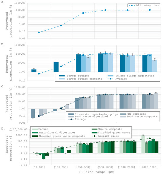 The results for the proportion of recovery as a function of MP size categories all demonstrate the same pattern overall (Figure 4; Table S3). First, for the size categories 500–1000, 1000–2000 and 2000–5000 µm and whatever the OWP category, the recovered proportion values approached 100%. This observation is in line with theoretical expectations, since the two size categories 500–1000 and 1000–2000 µm were used as a reference for calculating the distribution of microplastics. However, the extraction rate decreased rapidly from the 250–500 µm size category onwards, with a recovered proportion of merely 37.9%. Finally, for the 50–100 and 100–250 µm size categories, the recovered proportions were only 0.07% and 0.7%, respectively. Despite the observed similarity in the patterns across the different OWP categories (i.e., theoretical recovered proportion close to 100 between 500 and 5000 µm, with a significant decrease below 250 µm), when looking closely, a contrasting situation was observed (Figure 4A). For the WWTP sludge category, recovery was notably higher than the overall average, with rates of approximatively 1.9% (50–100 µm), 12.3% (100–250 µm) and 91.7% (250–500 µm) (Figure 4B). Conversely, digestates and composts from WWTP sludge, as well as MBT composts, did not facilitate the recovery of MP for the 50–100 and 100–250 µm size categories (Figure 4A,C). Finally, it can be noted that the recovered proportions were slightly better overall for OWP of agricultural origin (Figure 4D) in comparison to OWP from treated sewage sludge (Figure 4B) or from food waste (Figure 4C).