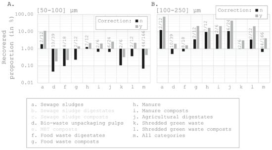 Presentation of the recovered proportion before (n) and after correction by proportionality (y) to take account of the fact that for the 50–100 µm (A) and 100–250 µm (B) size categories, not all the filters could be analysed by FPA-FTIR. The pale grey OWP categories (b,c,e) show the OWP categories for which no filters could be analysed, and therefore for which the correction calculations were not carried out.