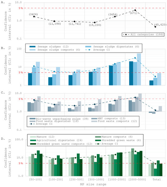 Notwithstanding the challenges encountered in the analysis of certain filters, over 45,000 microplastics, encompassing a wide range of sizes and OWP categories, were analysed by FPA-FTIR. The resulting confidence interval was calculated accordingly. For all aggregated data, the confidence interval was found to be less than p ± 0.5% (Figure 6A; Tables S4 and S5). When separated by size category, the confidence intervals range from p ± 0.8% (500–1000 µm) to p ± 3.8% (2000–5000 µm). The aggregated data for OWP related raw WWTP sludge, digestate and compost showed values of p ± 1.9%, p ± 2.6% and p ± 4.7%, respectively (Figure 6B). This phenomenon can be attributed to the enhanced rarity of microplastics within this size range. When the data were separated according to the different size ranges, it was not possible to achieve confidence interval values ≤ 5%. For the particle size category 1000–5000 µm, it was also not possible to ensure confidence intervals of p ≤ 10% (Figure 6C). For OWP derived from food waste, the confidence intervals for all size categories combined were between p ± 0.8% (MBT composts) and p ± 2.0% (food waste composts). When the calculations were separated according to the different size categories, it was confirmed that these results have a confidence interval of less than p ± 10% and sometimes even p ± 5% (bio-waste unpackaging pulps and MBT composts). Finally, for agricultural waste, the quantities of microplastics recovered were generally lower, resulting in generally higher interval values (Figure 6D). When all size categories were considered collectively, the confidence intervals ranged from p ± 2.6% (agricultural digestates) to p ± 7.2% (shredded green waste). It is important to note that the inclusion of size categories in the analysis led to increases in the confidence intervals, with values frequently exceeding p ± 10%, particularly in the categories of shredded green waste, shredded green waste composts, manure and manure composts.