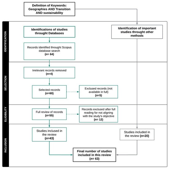 We adopted the latest version of PRISMA, which emphasizes transparency and quality in the selected studies. First, by mid-2024, a review of records in the SCOPUS database was conducted to identify relevant literature using the following keywords: “Geographies AND transition AND sustainability.” The Boolean method was used to include combinations of keywords appearing in the titles, keywords, or abstracts of the records. The term “Geography of Sustainability Transitions” (Figure 1) produced 64 records in Scopus (including unavailable records). The choice to use the SCOPUS database for the analysis is based on three main considerations: (i) the high quality of the indexed sources, such as peer-reviewed journals, which ensure reliable data; (ii) its global coverage, which allows for comparative and international analysis; and (iii) its academic recognition, being one of the most respected and reliable databases in the scientific community, ensuring the relevance and credibility of the obtained results. In addition to the records identified in the SCOPUS database, highly cited articles on Sustainability Transitions were included to ensure the comprehensiveness and relevance of the study.