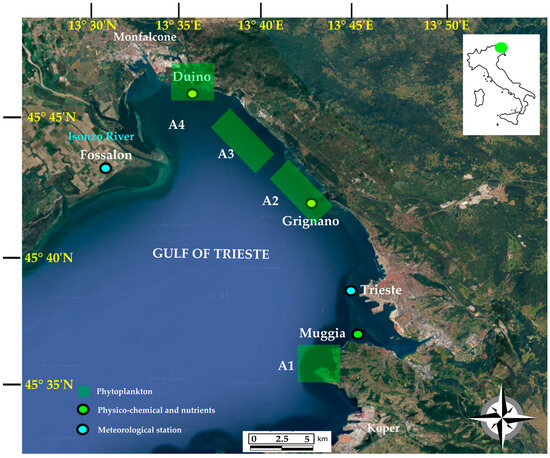 - Cozzi, S.; Cabrini, M.; Kralj, M.; De Vittor, C.; Celio, M.; Giani, M. Climatic and Anthropogenic Impacts on Environmental Conditions and Phytoplankton Community in the Gulf of Trieste (Northern Adriatic Sea). Water 2020, 12, 2652. [Google Scholar] [CrossRef]