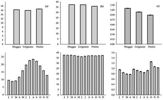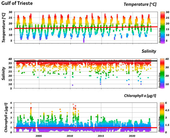 - Malačič, V.; Celio, M.; Čermelj, B.; Bussani, A.; Comici, C. Interannual Evolution of Seasonal Thermohaline Properties in the Gulf of Trieste (Northern Adriatic) 1991–2003. J. Geophys. Res. 2006, 111, 2005JC003267. [Google Scholar] [CrossRef]