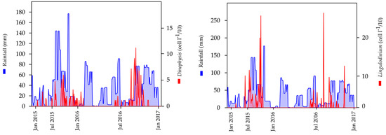 4.3. Correlation of Toxic Phytoplankton with Physico-Chemical Parameters, Nutrients, and Rainfall