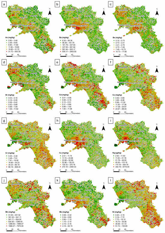 Raw distribution maps of (a) As; (b) Ba; (c) Be; (d) Bi; (e) Cd; (f) Co; (g) Cr; (h) Cu; (i) Hg; (j) Mn; (k) Mo; (l) Ni. Six class intervals were defined using the median (M) and standard deviation (σ) values, as follows: <(M − 2σ); (M − 2σ) − (M − 1σ); (M − 1σ) − (M + 1σ); (M + 1σ) − (M + 2σ); >(M + 2σ).