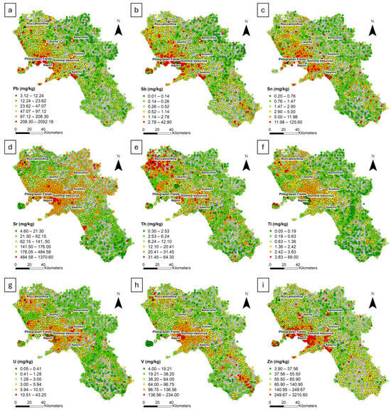 Raw distribution maps of (a) Pb; (b) Sb; (c) Sn; (d) Sr; (e) Th; (f) Tl; (g) U; (h) V; (i) Zn. Six class intervals were defined using the median (M) and standard deviation (σ) values, as follows: <(M − 2σ); (M − 2σ) − (M − 1σ); (M − 1σ) − (M + 1σ); (M + 1σ) − (M + 2σ); >(M + 2σ).